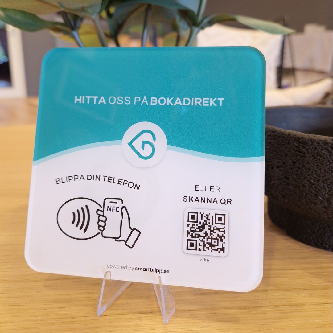 Med Smart Blipps BokaDirekt NFC-skylt kan dina kunder boka en tid hos dig på bara några sekunder. Skylten är utrustad med NFC-teknologi och en tydlig QR-kod, och levereras färdigprogrammerad med din BokaDirekt-profil.