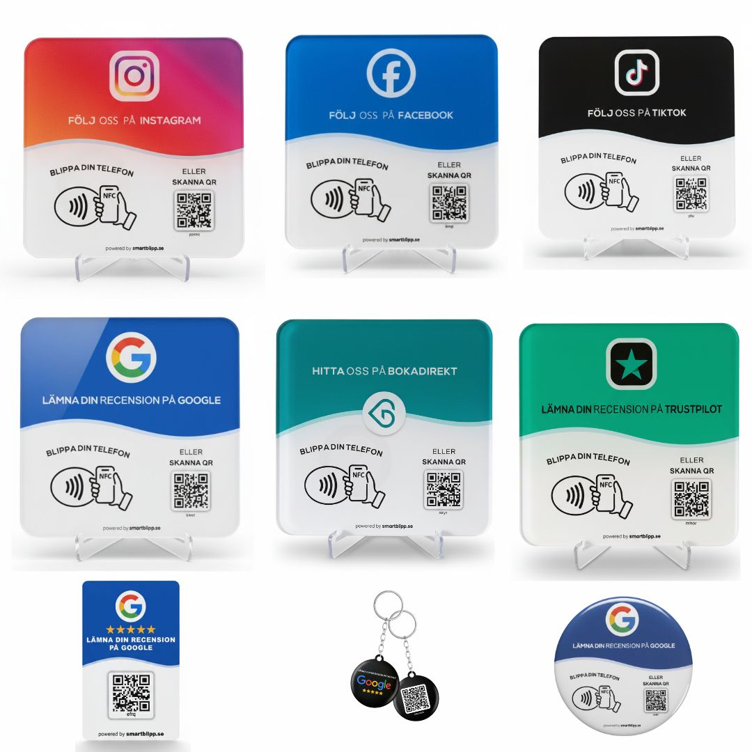 Bygg ditt eget paket och spara stort! Med vårt bundle-erbjudande kan du välja fritt bland våra mest populära skyltar: Google, Instagram, Facebook, TikTok, BokaDirekt och Trustpilot.