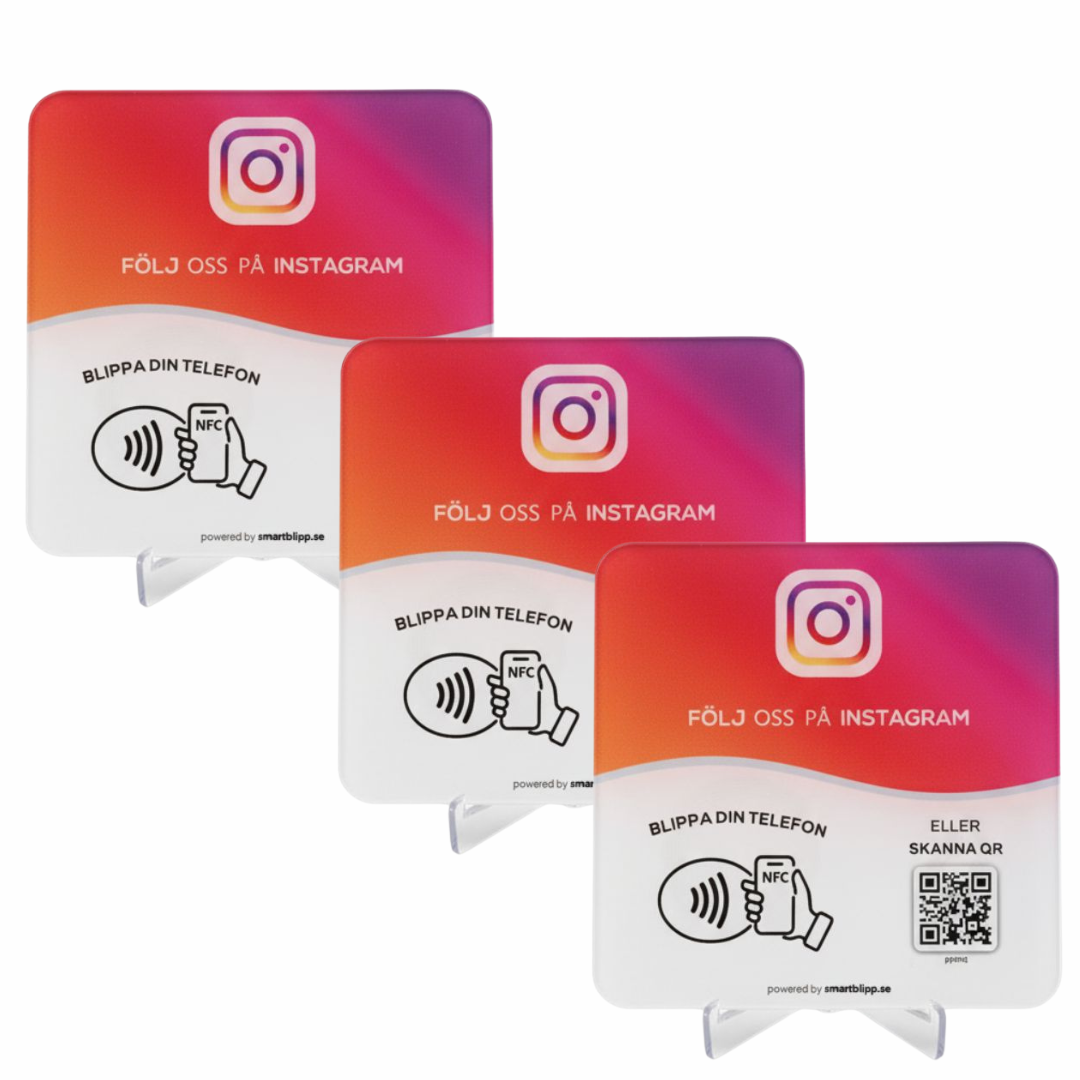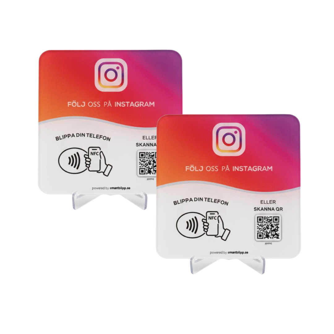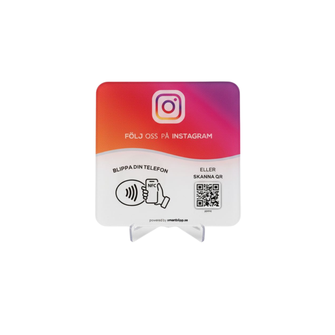 Med Smart Blipps Instagram-skylt behöver dina kunder bara blippa eller skanna för att direkt komma till din Instagram-profil. Skylten är utrustad med både NFC-teknik och en tydlig QR-kod, och levereras färdigprogrammerad – redo att användas direkt.