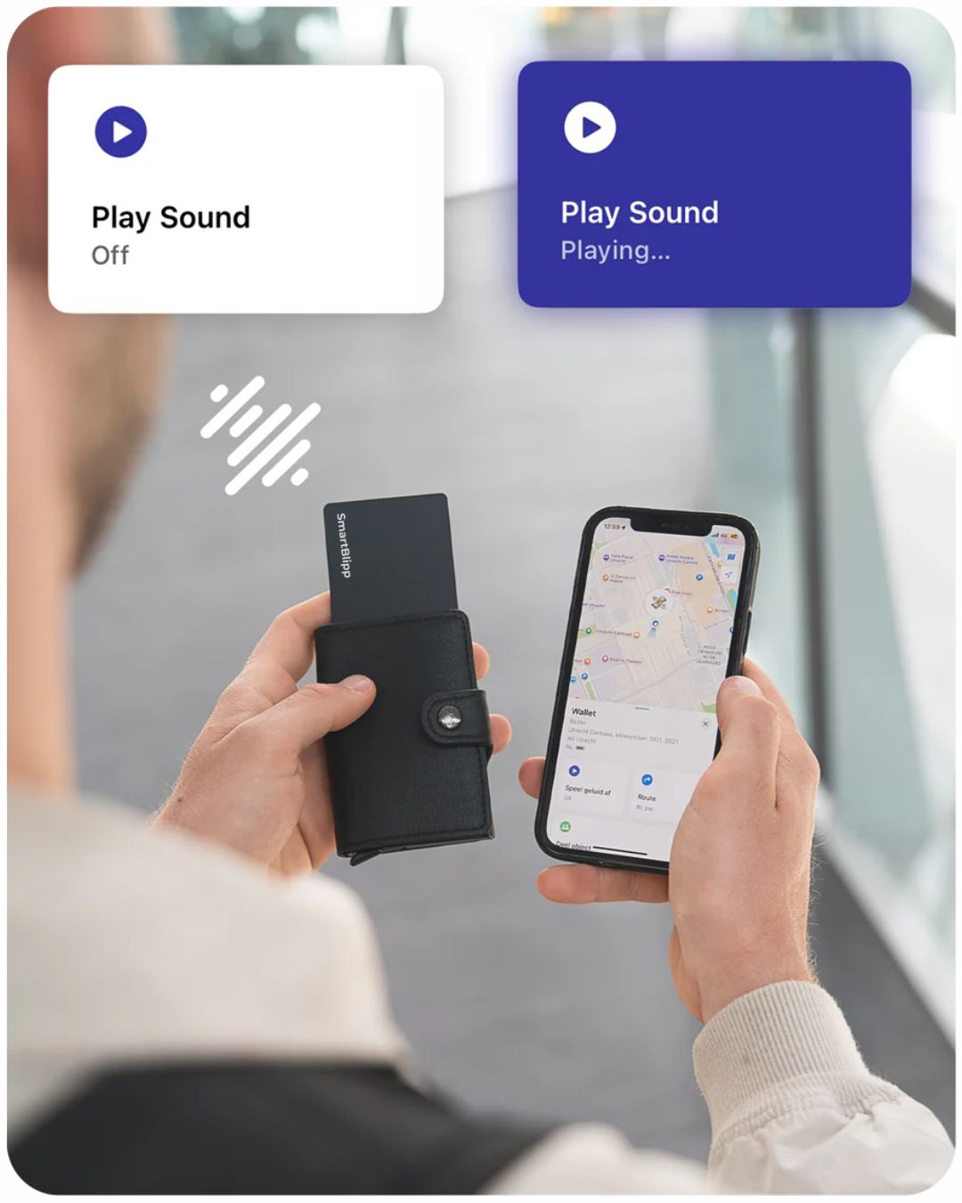 SmartBlipps spårningskort är ett ultratunt och elegant kort som fungerar med både iPhone (Apple Find My®) och Android (Google Find My Device).